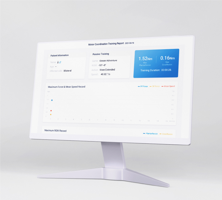 With force and position sensors, the AnkleMotus™ can measure the user's performance from multiple prospects, including range of motion, cognition and response time.